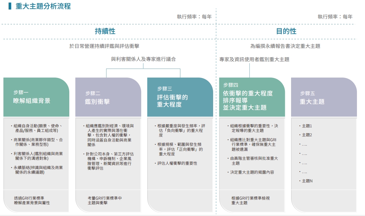 崴正每年定期辦理一次重大性分析,依循 GRI 永續性報導準則,系統性檢視企業在環境、社會與治理面向所造成的實際與潛在衝擊,並據此鑑別永續報告之重大主題。