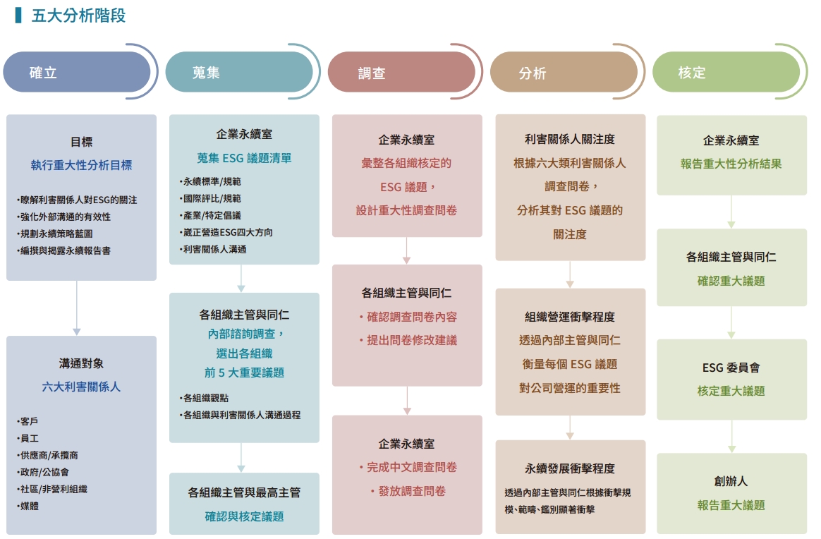本年度係依據 GRI 通用準則 2021(GRI Universal Standards 2021)中之 GRI 3:重大主題要求,建構以衝擊為基礎的重大性分析流程,透過五大步驟進行議題辨識與評估。分析結果經永續委員會審議與決議後,最終確認 14 項重大性主題,作為崴正 2024 年永續報告之核心揭露內容。