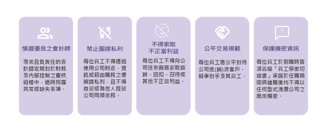 公司依據營運所在地法令及內部規範,制定《誠信經營政策》、《誠信經營作業程序及行為指南》,並建立防貪腐制度、申訴與檢舉管道及內部控制流程,要求全體同仁於執行職務時恪遵法令與誠信原則。