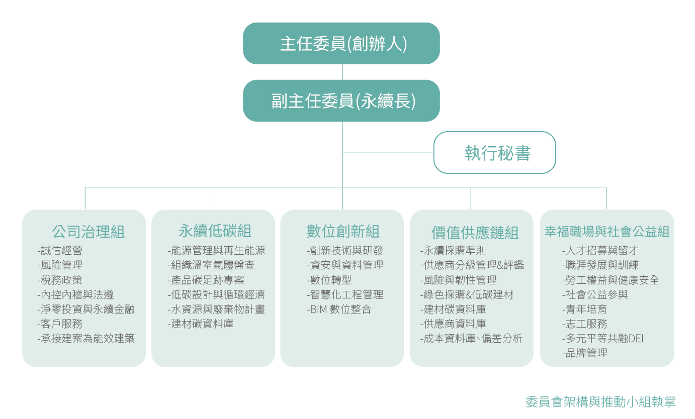 永續發展委員會由創辦人擔任主任委員負責架構與推動小組執掌,並推派副總經理擔任副主任委員,而為落實企業永織相關工作,委員會下設立「五大推動小組」小組召集人由公司內部相對應之部門最高管理者兼任,並由主任委員指定永續室同仁為執行秘書,以確保企業永續發展相關工作的推動與落實。