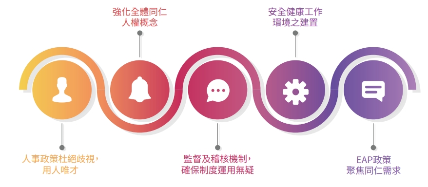 | 為落實人權,公司制定人權政策、性騷擾防治措施及懲戒辦法、執行職務因他人行為遭受身體或精神不法侵害(職場暴力防範)預防辦法、 職安衛政策,在新人教育訓練進行佈達,並提供申訴管道,包含電話、email ,並由專責部門處理回覆,以公平公正原則處理檢舉內容。 | ![]()